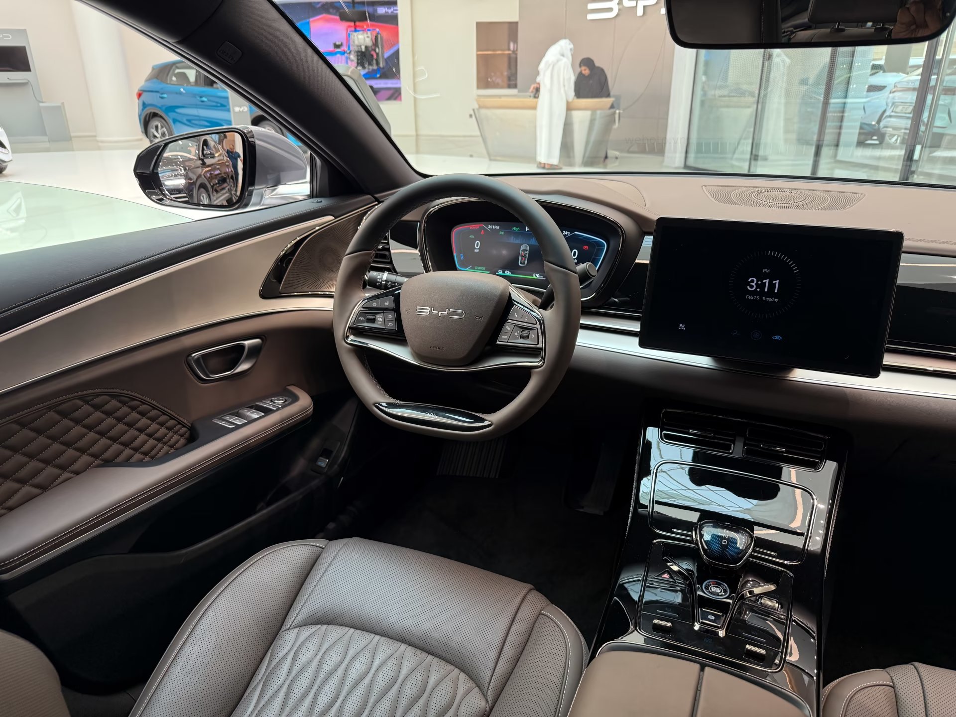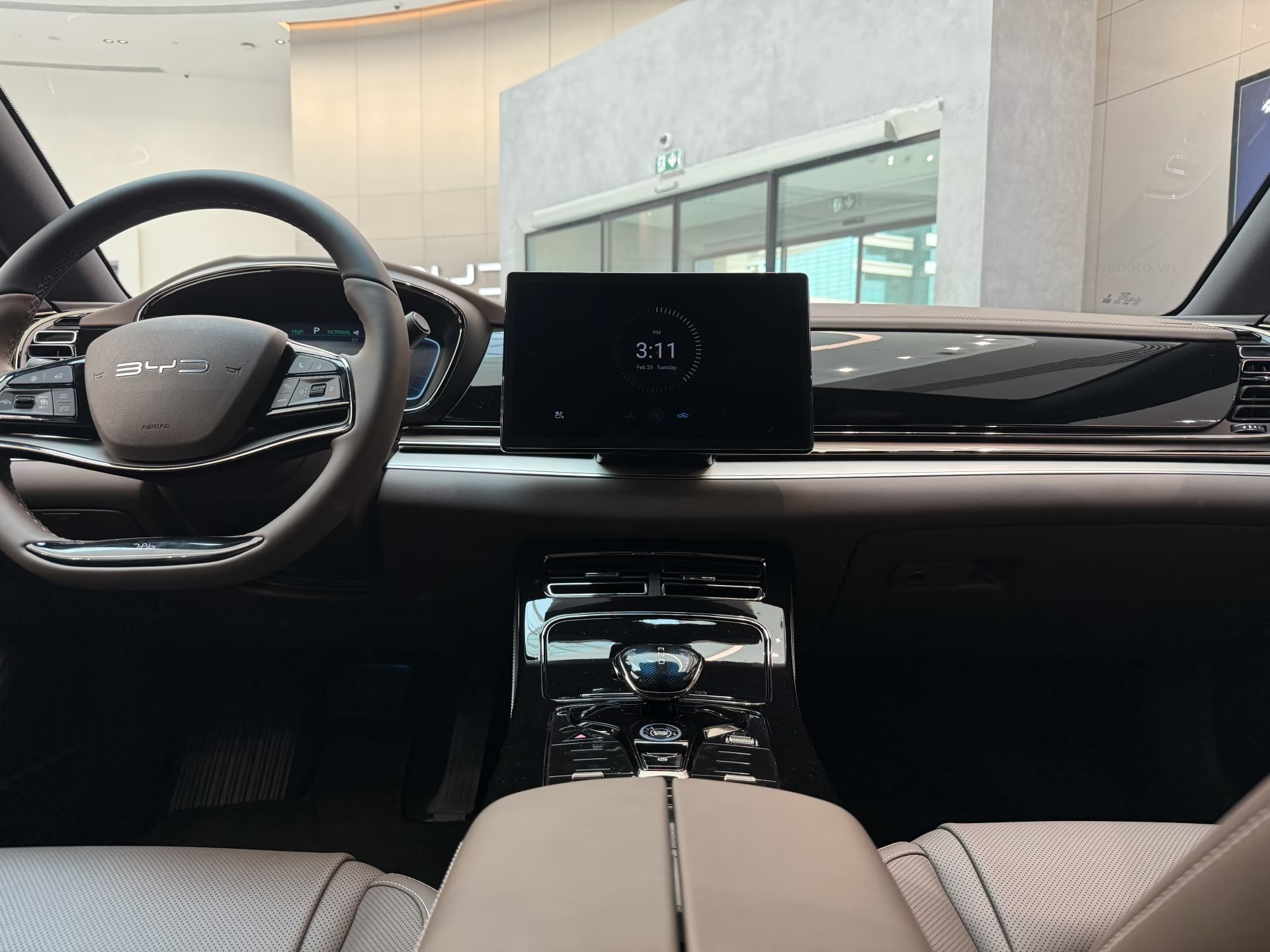 BYD Han sở hữu nội thất hiện đại với chất liệu da Nappa cao cấp kết hợp nhựa mềm, carbon, kim loại và các chi tiết mạ crôm tinh tế. Vô-lăng hai chấu bọc da với logo BYD cách điệu mang đến cảm giác mới mẻ và sang trọng. Bảng táp-lô được trang bị màn hình giải trí kích thước lớn 15,6 inch có khả năng xoay ngang hoặc dọc tùy ý. Cửa gió điều hòa dạng nấc thang độc đáo cùng táp-bi cửa bọc da vân quả trám góp phần nâng cao sự sang trọng cho nội thất.