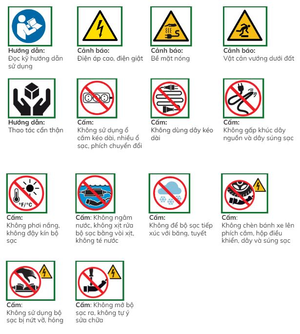 - Đọc và làm theo các hướng dẫn an toàn trong sách hướng dẫn sử dụng sạc và trong sách hướng dẫn sử dụng xe.